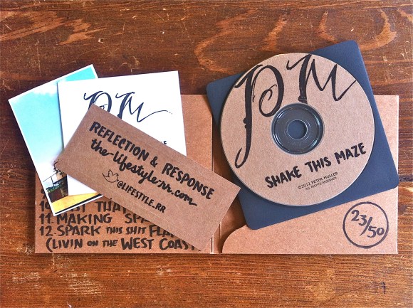 I printed the “PM” logo and the “Shake This Maze” lettering on Brown Kraft CD Labels, which we then threw on each CD..