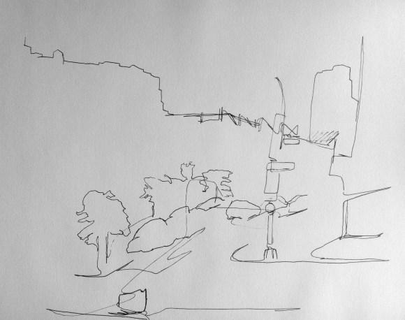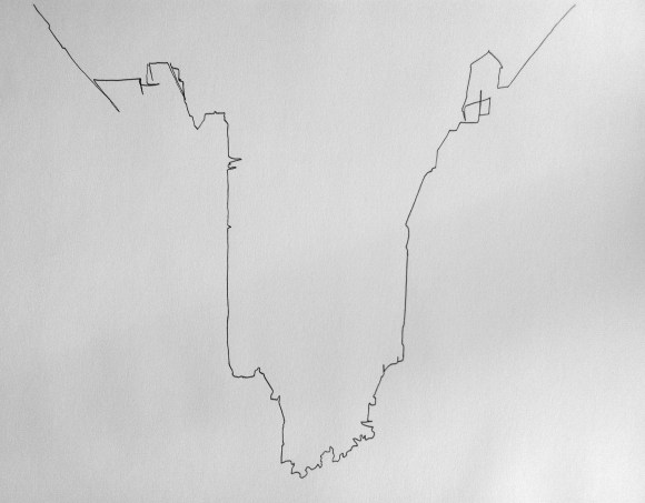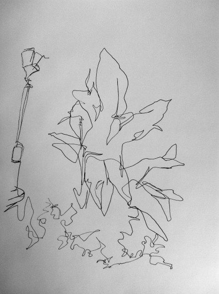 Lamp with Plant is the first installation in Contours, a series of drawings that I’ll be developing over the next several weeks. This series is based on methods of blind contour drawing, which involves drawing contours, or outlines, of forms while looking at subjects, without looking down at the paper or lifting pen from paper. Being “blind” to the drawing process essentially breaks the connection between seeing and drawing and leaves them physically isolated from each other. This makes it necessary to attempt to re-create that connection by focusing on seeing as if you were drawing, and then drawing that vision. Blind contour is often used simply as practice to strengthen the eye/hand connection, but I find the resulting drawings very truthful in their structure, layout, and irregularities. Contours will show my Reflection and Response interactions with various people, places, and things through focused and “blind” studies.